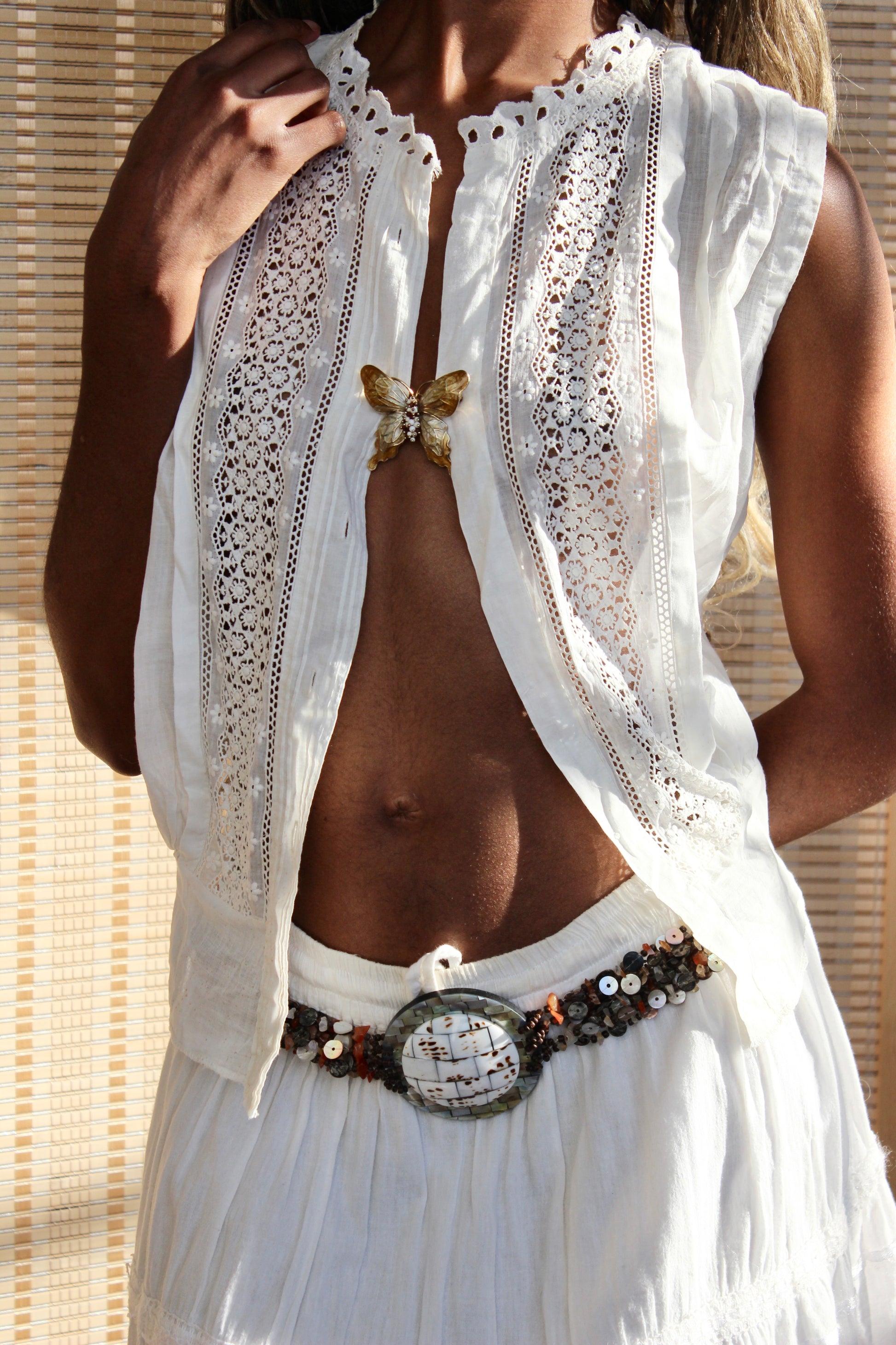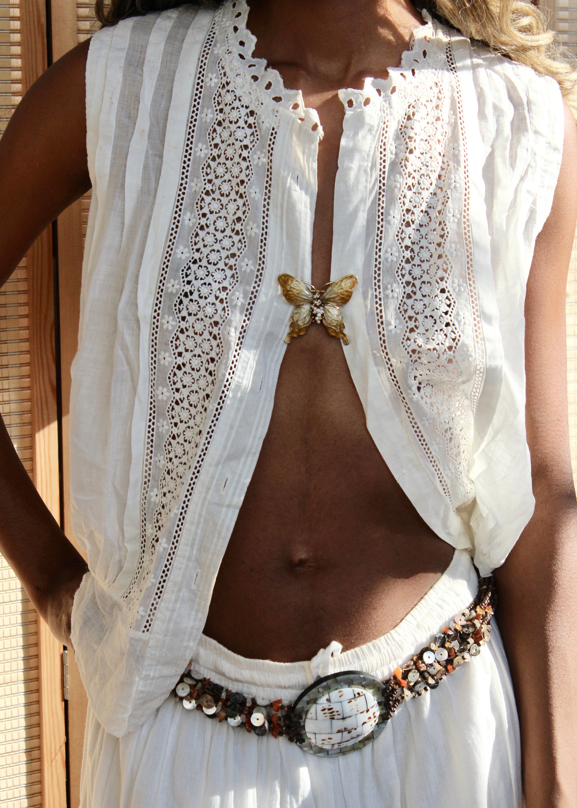 A rare and beautiful antique Edwardian blouse dating to the late 1800s. Crafted from lightweight cotton with intricate lace inserts, pintuck detailing, and a softly structured sleeveless silhouette, this piece is a true historical garment. The delicate construction and handmade details reflect the craftsmanship of the era.