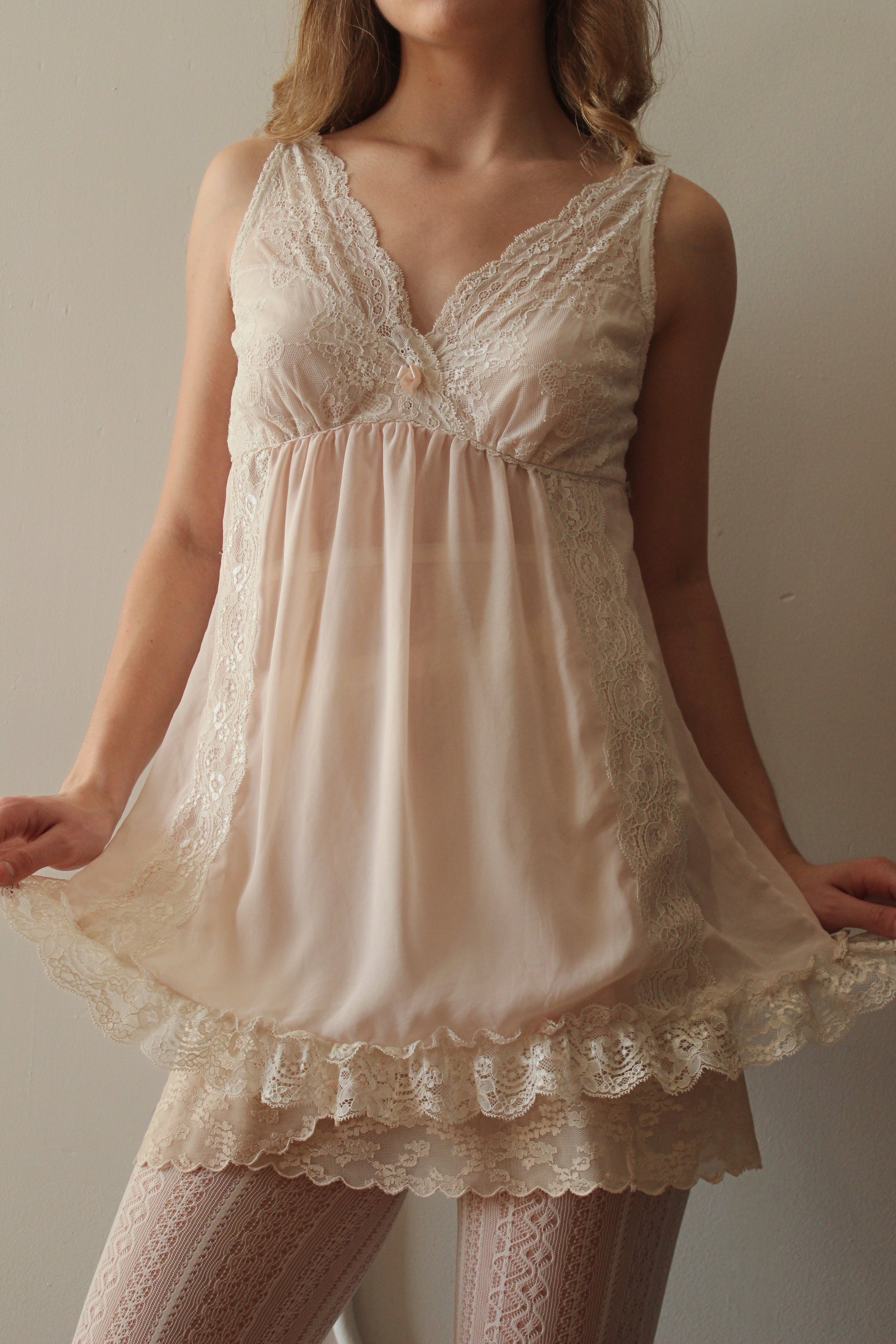 Sweet, delicate, and effortlessly feminine. This baby pink lace teddy features a soft V-neckline with floral lace detailing, a flowy empire-waist silhouette, and a lightweight, airy feel that drapes beautifully on the body. Finished with lace trim along the hem, it has that perfect vintage lingerie charm — flirty, dreamy, and timeless.