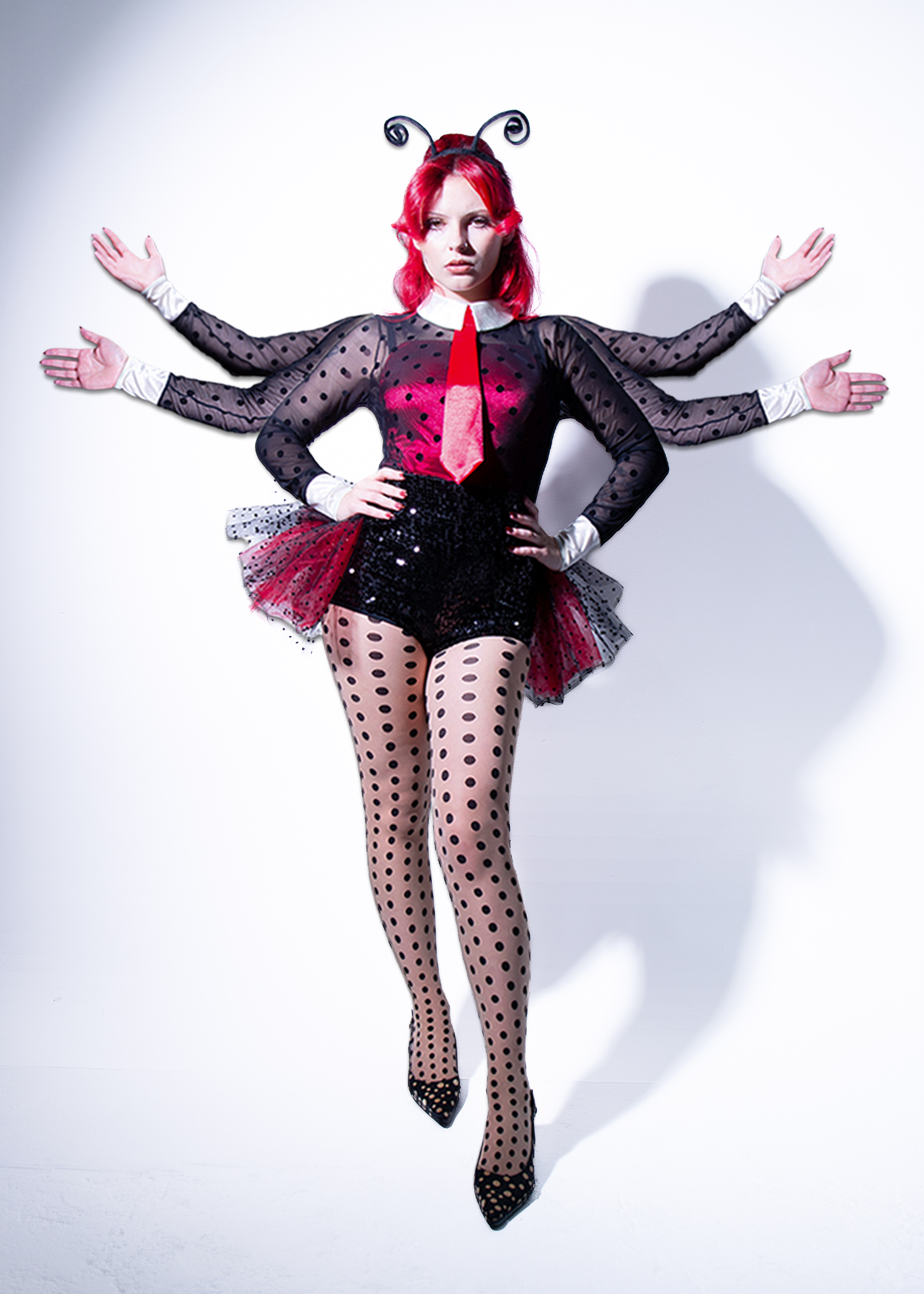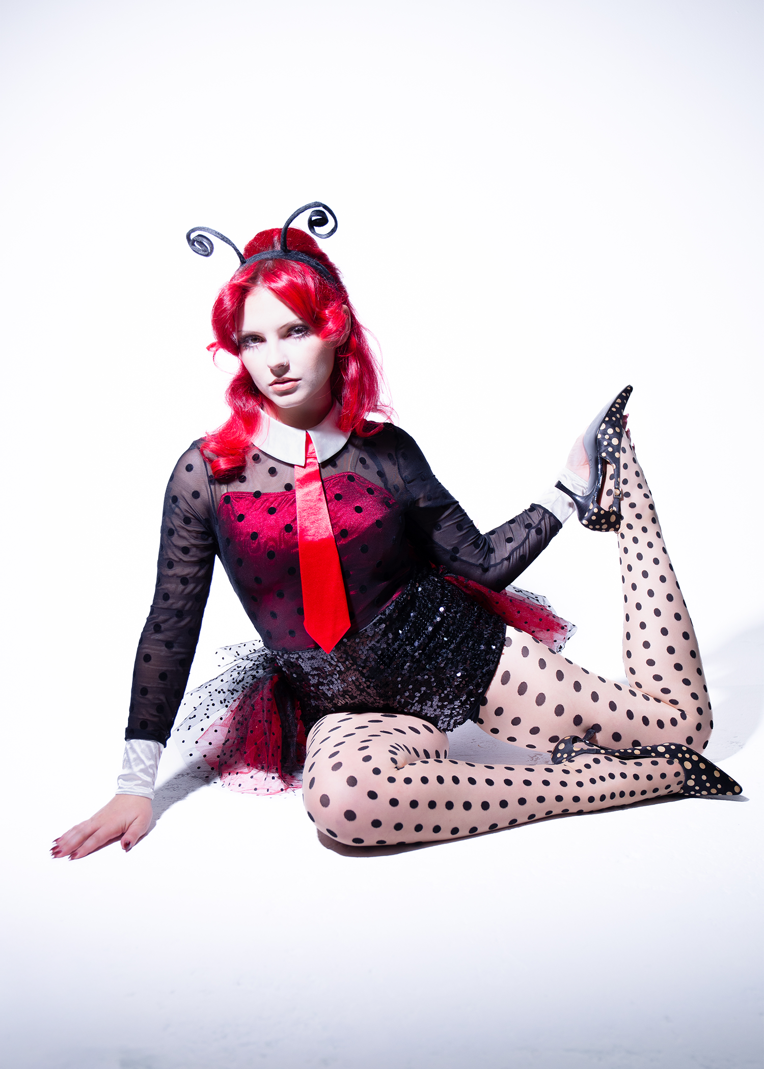 A unique spin on the classic ladybug costume, this vintage look has burlesque charm. The polka-dot mesh overlay long sleeve top, tie, and sparkly shorts with a tutu-style back make for the cutest look for Halloween.