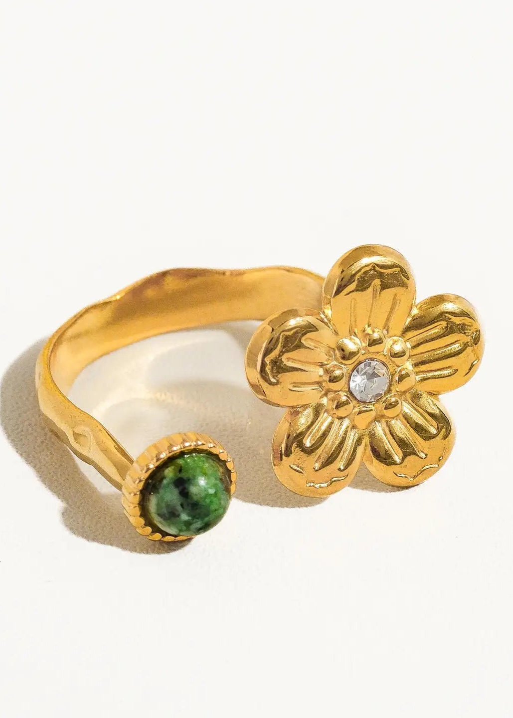 Inspired by free-spirited style, the Marigold Boho Ring pairs a golden flower with a sparkling crystal center and a deep green stone accent. Its open wrap design gives it a laid-back yet elegant vibe, perfect for stacking or wearing solo. Finished with a non-tarnish coating, this ring stays radiant through every adventure.