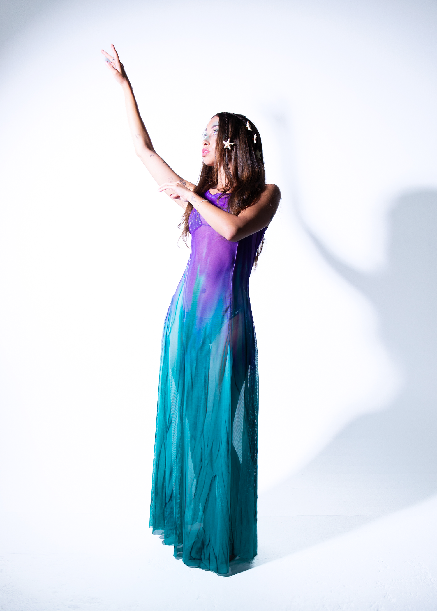 An underwater fantasy come to life, this sheer mesh dress in shades of purple and teal creates the perfect mermaid illusion. Flowing and ethereal, it’s made for anyone ready to make waves this Halloween.