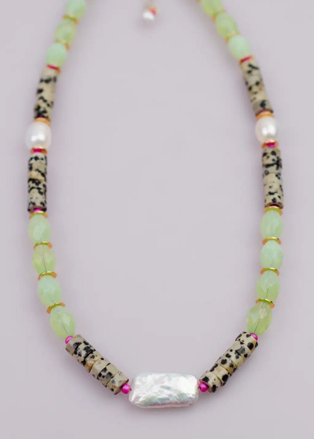 This necklace showcases an assortment of beads, including dalmatian jasper, mother of pearl, sea foam green translucent Czech glass, and seed beads.