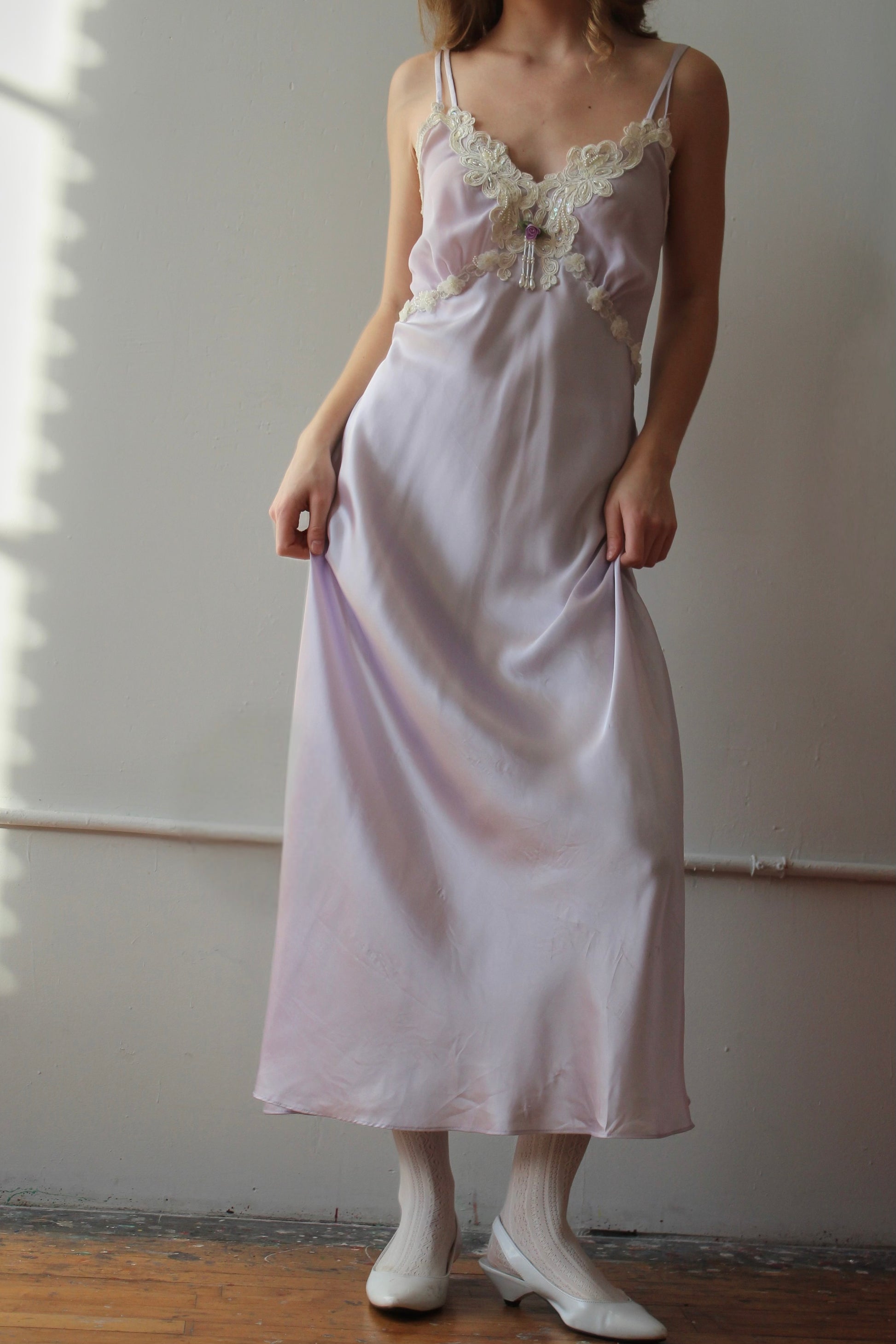 Vintage Private Luxuries slip dress in a soft lavender satin with delicate floral beading and lace trim at the bust. Features adjustable spaghetti straps, a flattering V-neckline, and a flowy midi-to-maxi length silhouette. Lightweight with a subtle sheen and a romantic, ethereal feel — perfect for special occasions or dreamy everyday wear.