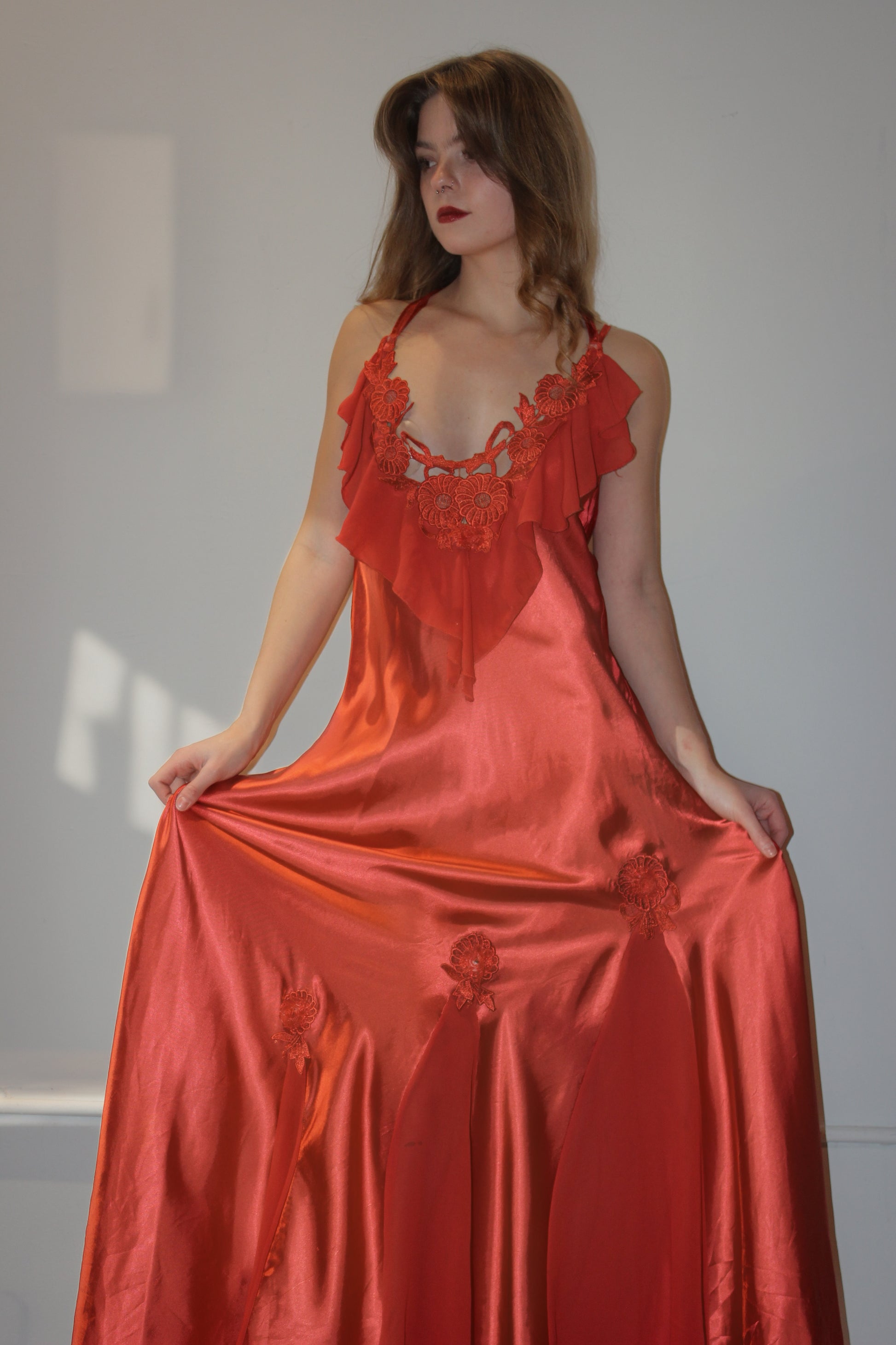 A true statement slip with old-Hollywood drama. This rich red satin dress features cascading ruffle details, delicate floral appliqué accents, and a flowing full-length silhouette that moves beautifully with every step. The soft sheen of the fabric catches the light, while the sculpted neckline and layered skirt give it an ultra-feminine, vintage-inspired feel.