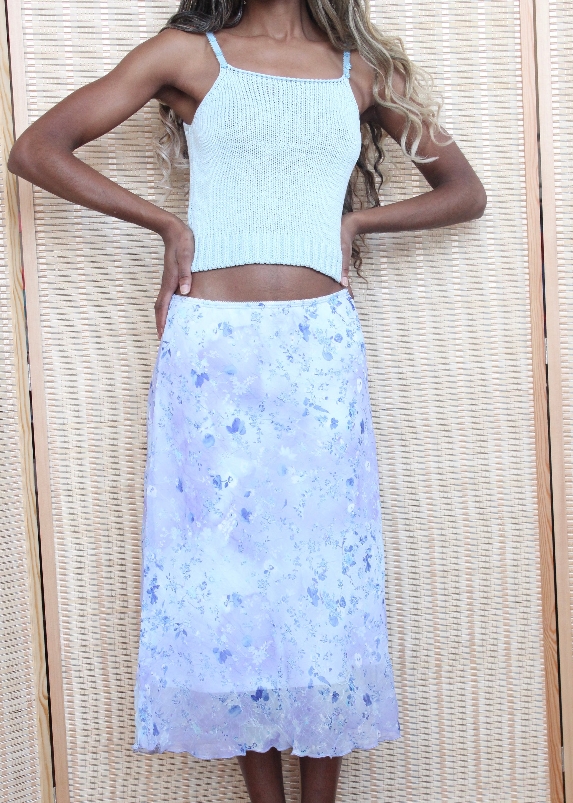 A dreamy vintage midi skirt featuring a delicate lavender and periwinkle floral print on a sheer, lightweight fabric. Designed with a softly flared silhouette and a subtle ruffled hem, this piece moves beautifully and layers effortlessly.