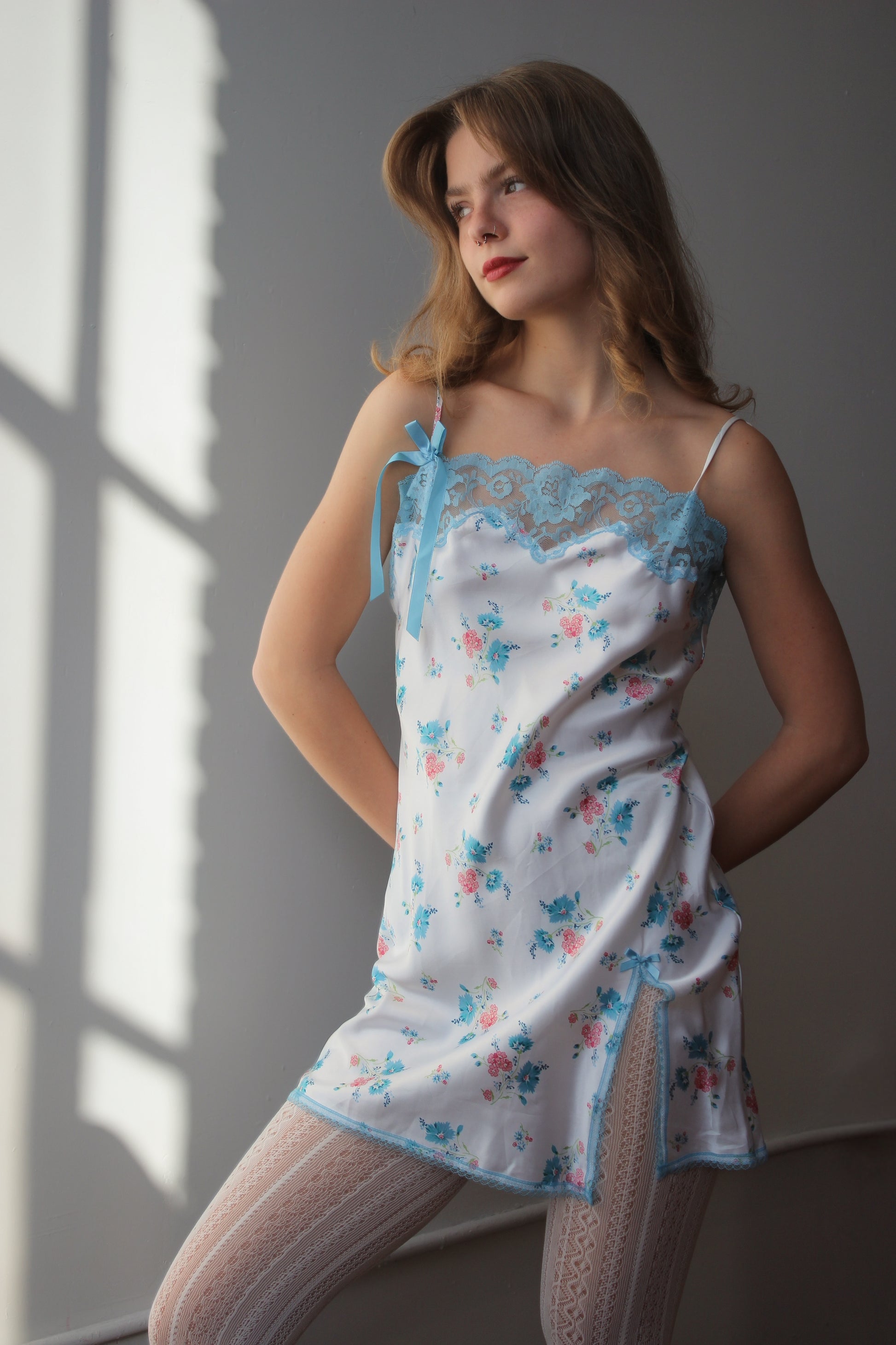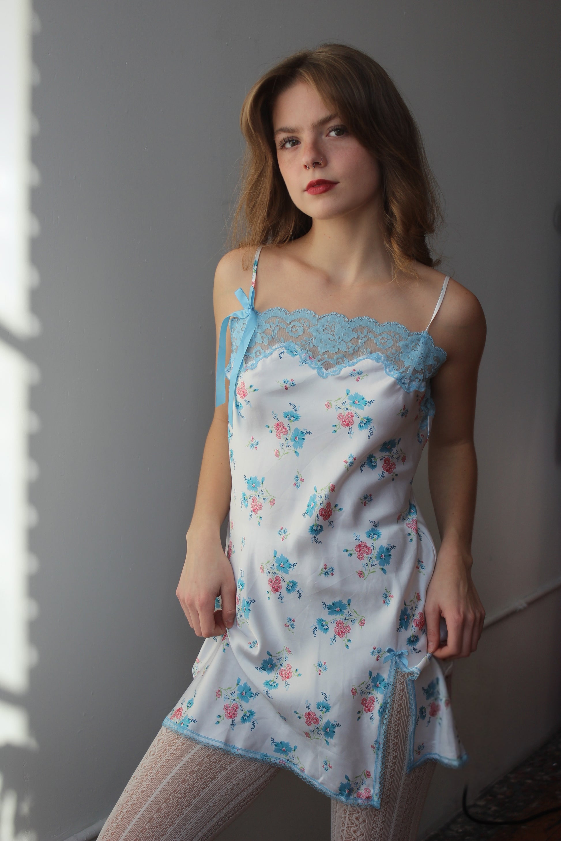 Sheer satin feel | Blue lace trim | Adjustable straps | Mini length | Floral print