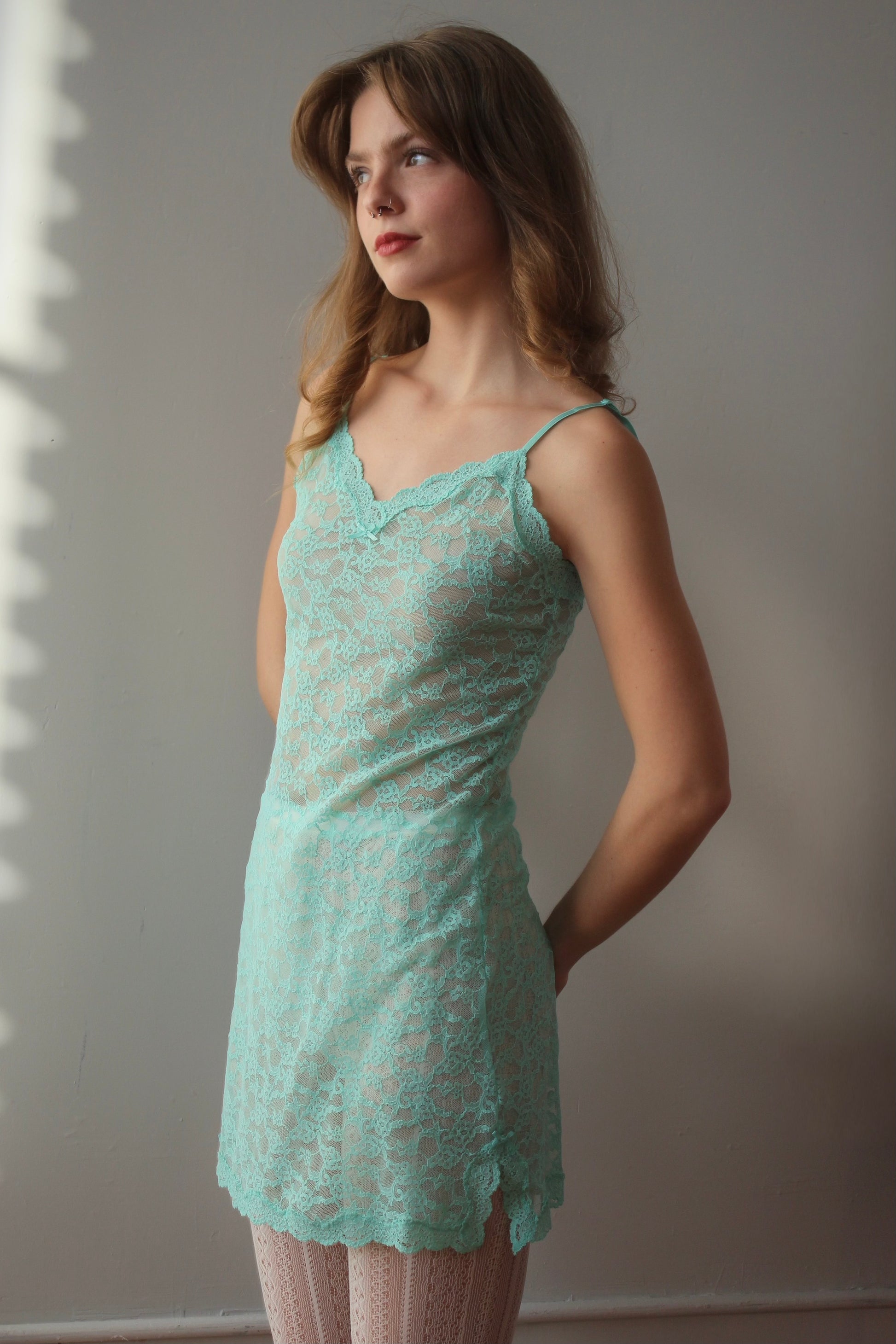 A bold pop of color with classic Victoria’s Secret allure. This turquoise lace mini dress features a sheer floral lace overlay, delicate spaghetti straps, and a figure-hugging silhouette that shows just the right amount of skin. The vibrant aqua tone gives it that iconic early-2000s energy, perfect for nights out, layering over lingerie, or serving full VS Angel fantasy.